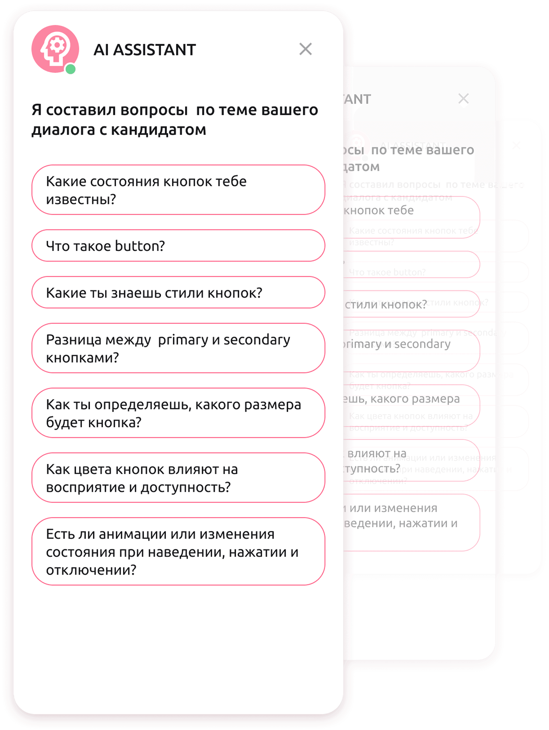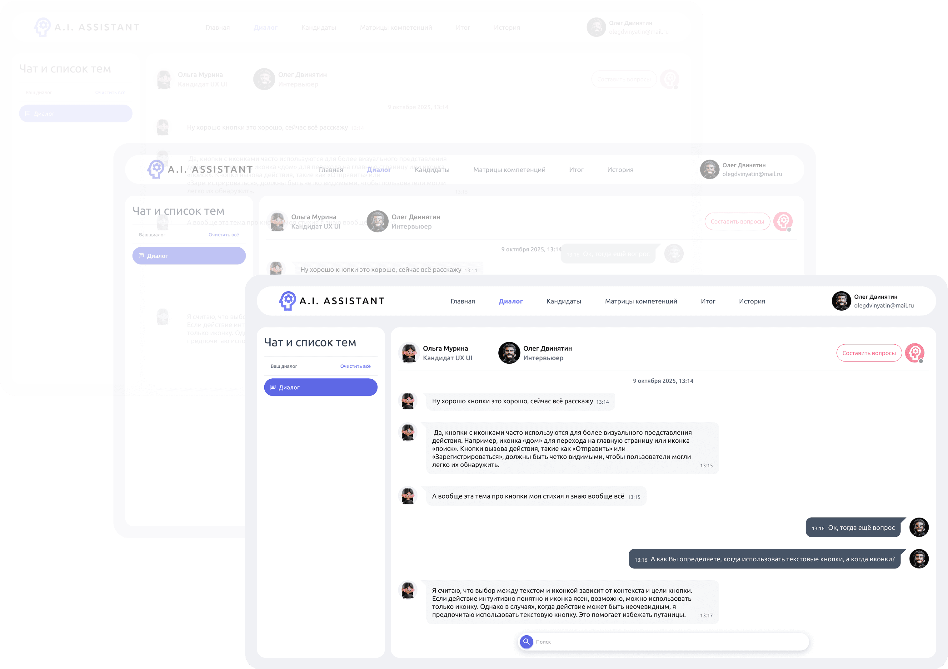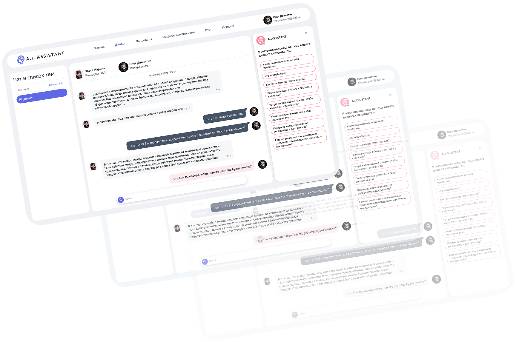 A.I. ASSISTANT записывает диалог в режиме реального времени, обеспечивая детальный анализ сообщений и взаимодействий с кандидатом